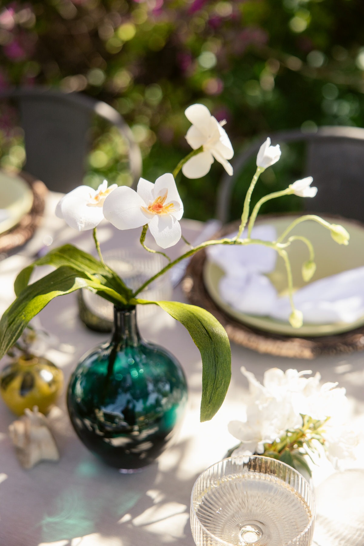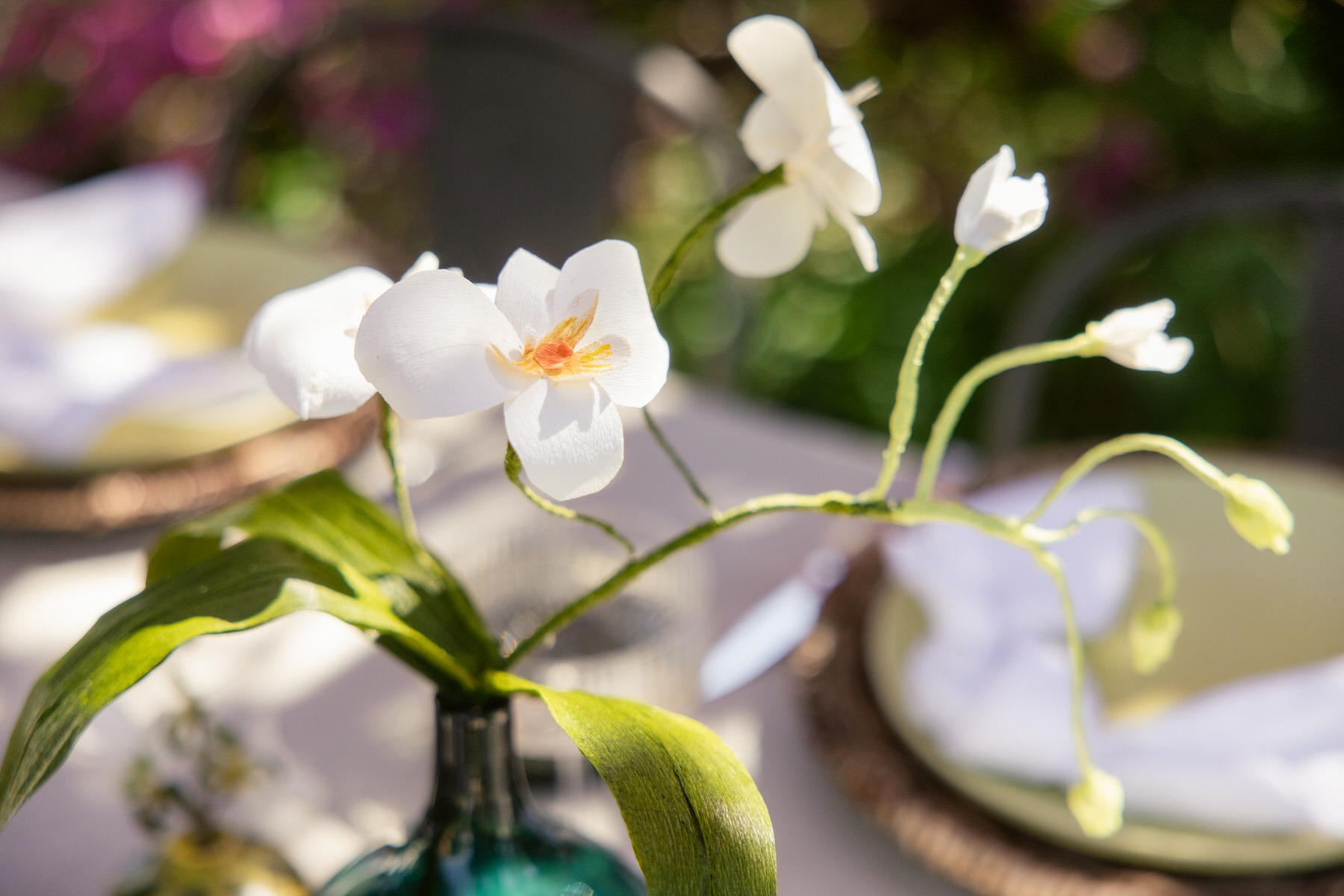- Handcrafted paper orchids in simple glass vases