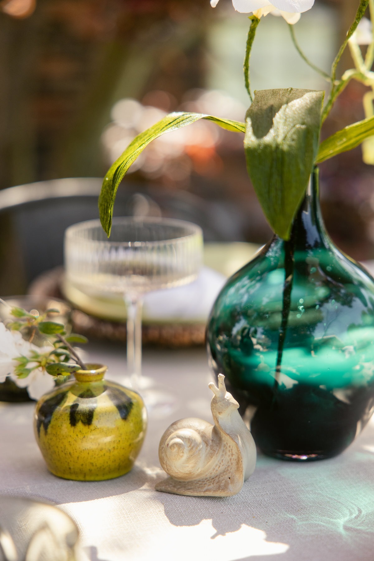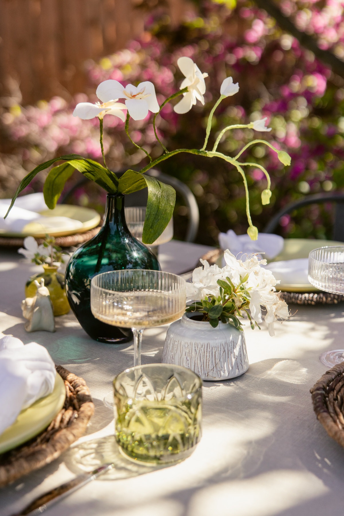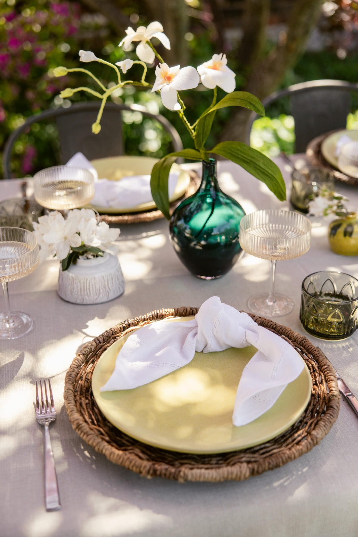 - Green rocks glasses as water glasses (pulling that chartreuse tone across the table without overdoing it)