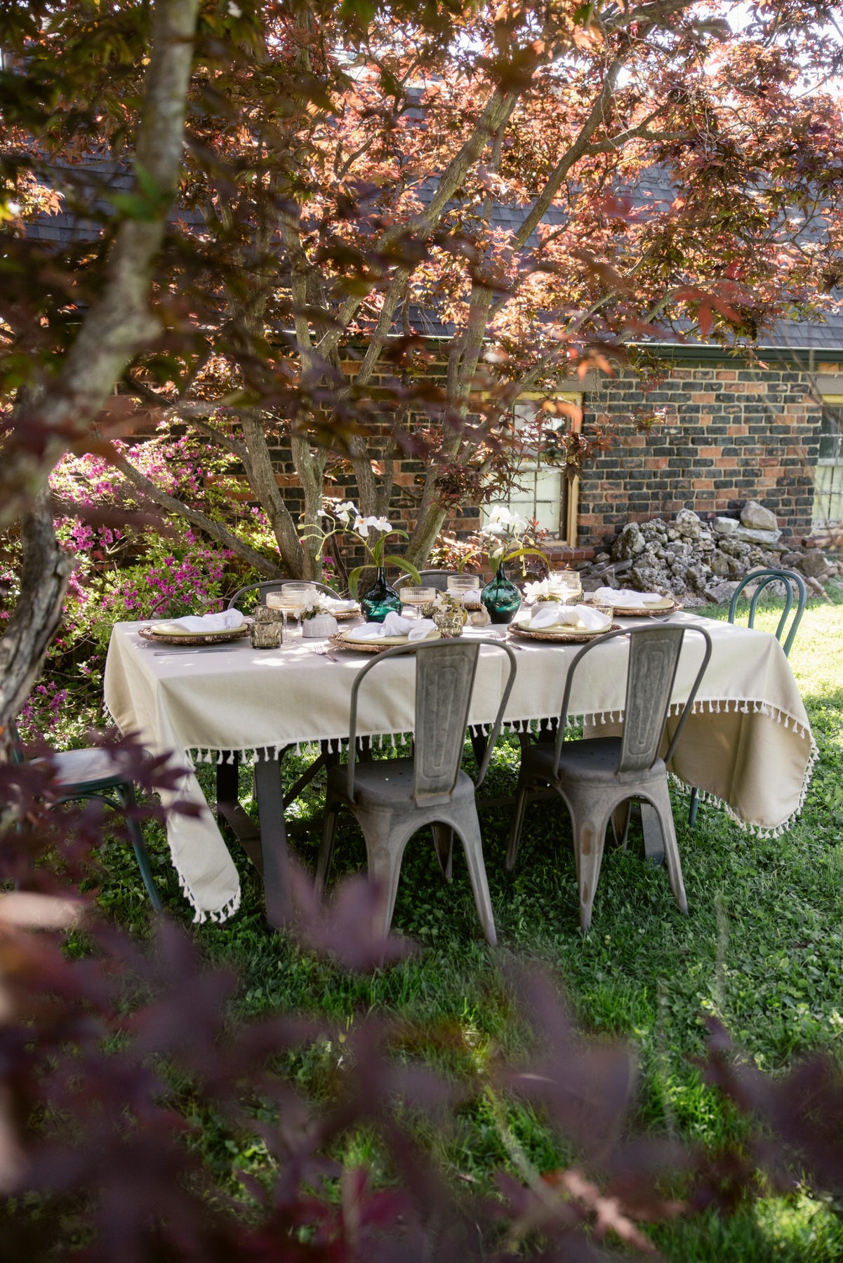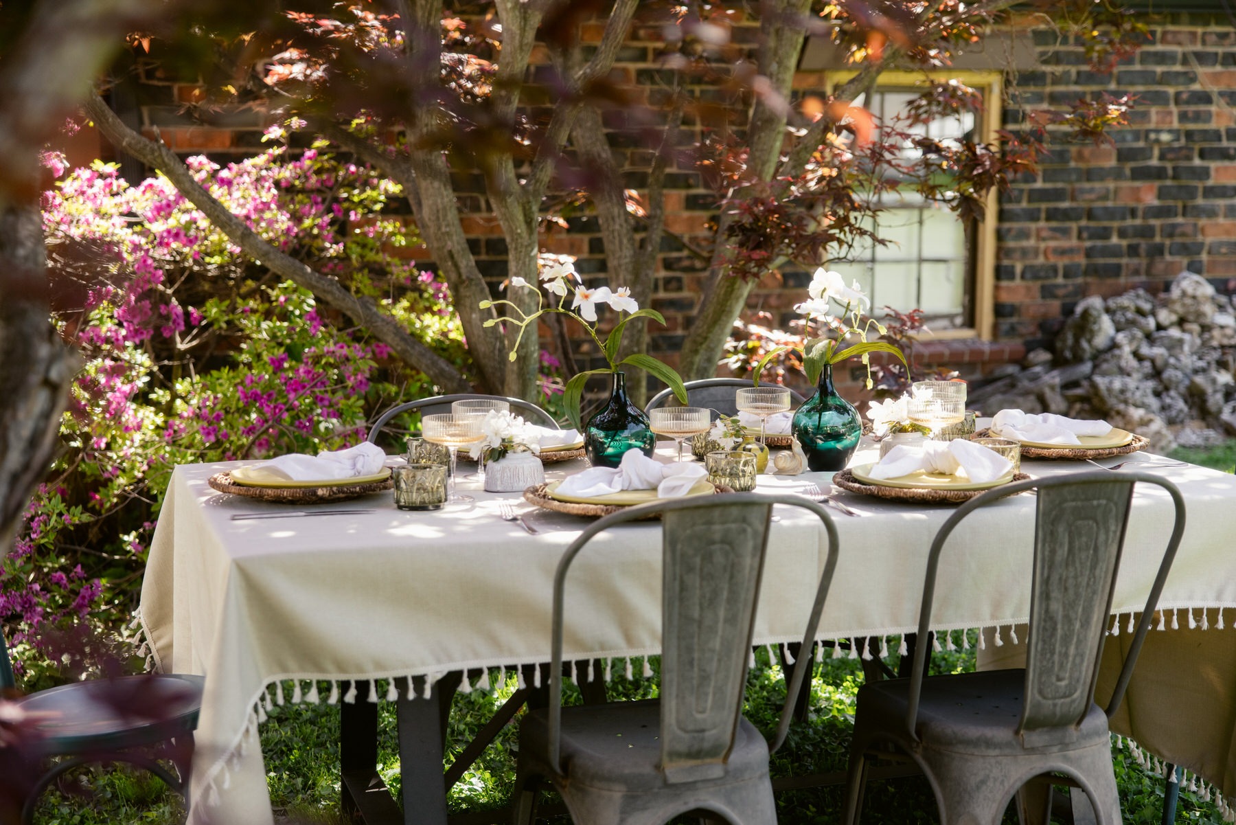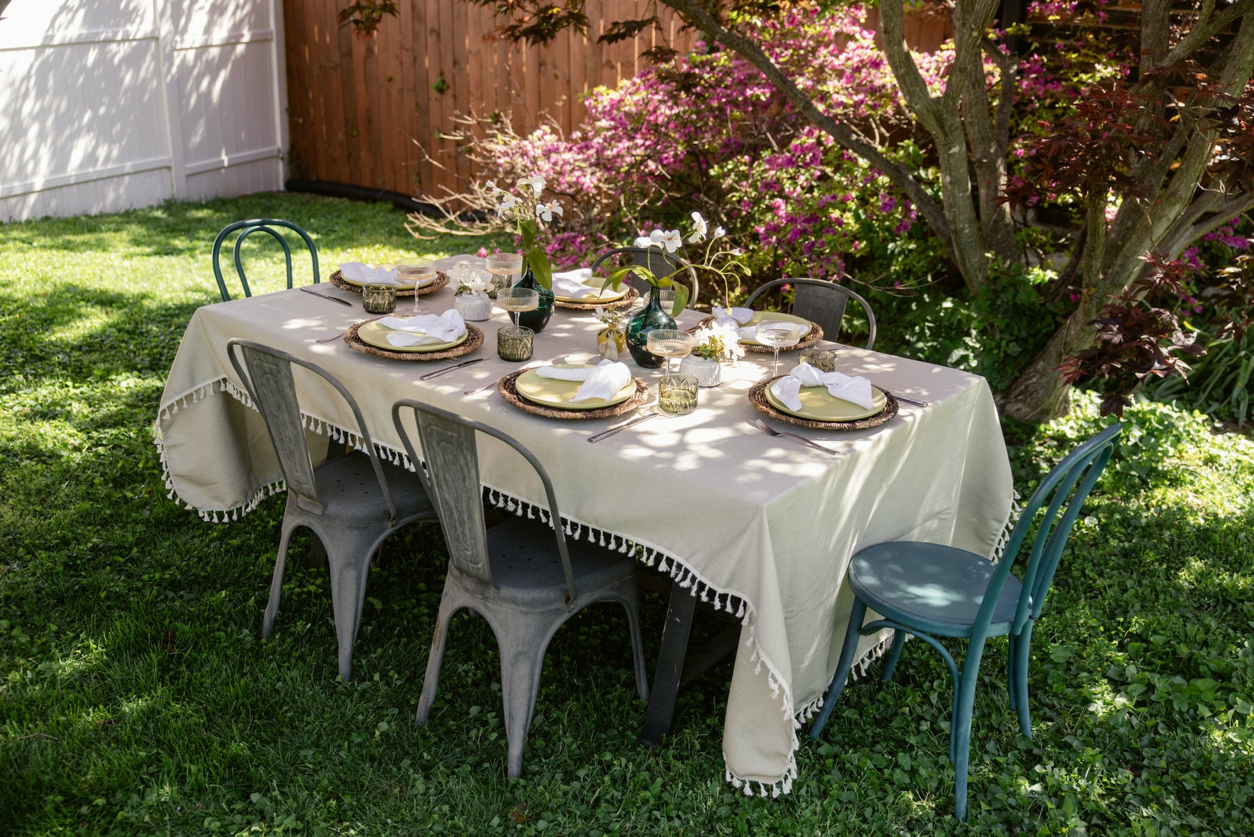 - Green rocks glasses as water glasses (pulling that chartreuse tone across the table without overdoing it)